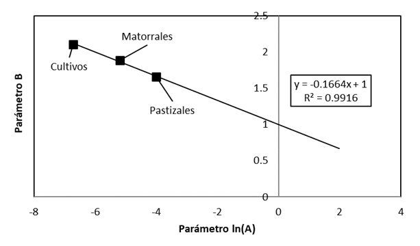 En la Figura 11 se observa la relación entre los parámetros de los modelos potenciales ajustados para la relación de S con la CPF EI para los matorrales, pastizales y cultivos agrícolas que, de manera similar a los bosques/selvas, se ajustaron a una línea recta que pasa por el punto (0,1).