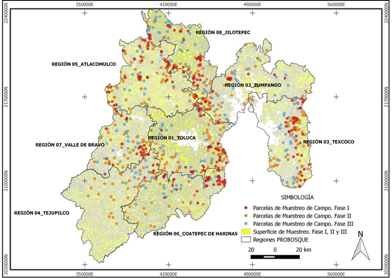 Se establecieron aleatoriamente sitios de muestreo de 1 000 m2. En el Cuadro 1 se presenta el número de sitios medidos en cada fase de la campaña, con un total de 682. El tamaño de la muestra se estimó con base en el protocolo para calcular el número de puntos de muestro usado en los proyectos de Mecanismos de Desarrollo Limpio para Forestación/Reforestación (A/R CMD project activity, por sus siglas en inglés) de la Convención Marco de Naciones Unidas para el Cambio Climático (UNFCCC, por sus siglas en inglés), mediante la herramienta metodológica A/R CDM Tool (2014), desarrollada por Winrock International (Pearson et al., 2005). Los sitios se distribuyeron en función de las regiones en que la Protectora de Bosques del Estado de México (Probosque) divide a la entidad. El uso de la fase de muestreo permite analizar la vegetación por dominancia del estado de sucesión secundaria.