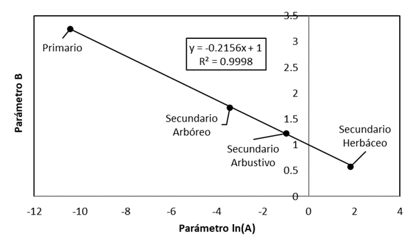 Al realizar un análisis con el modelo potencial S=A(CPF ES ) B , se observó que los parametros ln(A) y B están relacionados entre sí, ya que se interceptan en un punto común (0,1). En la Figura 7 se presenta la relación entre los parámetros de los modelos potenciales ajustados en la Figura 6; la línea recta pasa por el punto (0,1), dado que ln(A=1)=0 en el caso de B=1. Así, la relación entre los parámetros de los modelos potenciales requiere solo de conocer un dato para establecer las relaciones de los diferentes estados de la sucesión de bosques/selvas.