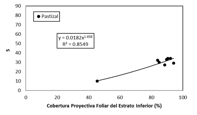En la Figura 5 se muestran los resultados obtenidos para el caso de bosques/selvas y sus estados de sucesión. La relación entre S y la CPF del estrato superior se ajustó a un modelo lineal: