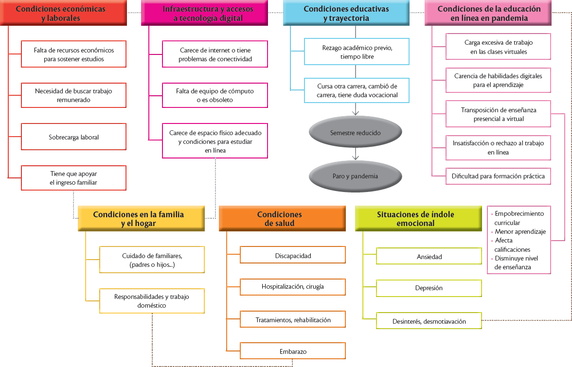 Las condiciones socioeconómicas y laborales de los estudiantes y sus familias resultaron las más críticas y fueron un factor determinante para tomar la decisión de interrumpir los estudios; además, parecen desencadenar o relacionarse con diversas situaciones que comprometen la salud y el bienestar emocional de los implicados. Ya se dijo que el 33% de los estudiantes solicitan baja temporal debido a motivos asociados a dificultades económicas, ya sea que las presentaban previamente o se agudizaron en la pandemia por la pérdida de empleo en la familia, fallecimiento de proveedor, necesidad de buscar trabajo o porque las exigencias laborales se vieron intensificadas.
