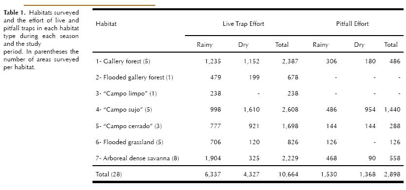 In the present study we observed a seasonal variation in the number of species and individuals captured by the live and pitfall traps, with more species and individuals being captured during the rainy season. Nevertheless, the only species that had an increase in the number of captures during the dry season was the grass mouse Necromys lasiurus.
