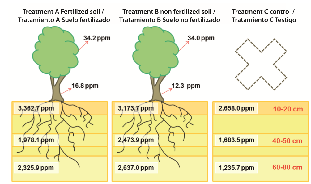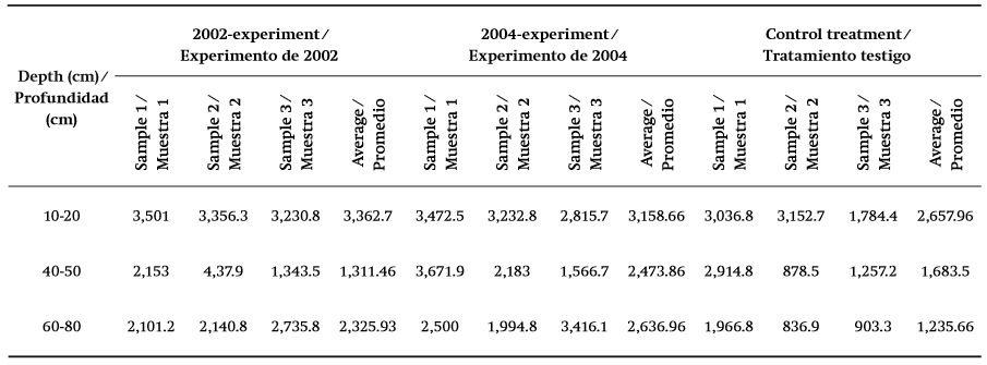 The average copper concentration at different soil depths (three samples for each depth at each treatment) showed higher concentration values closer to the soil surface (10-20 cm) with an average value of 3,064.8 ppm. Between 40 and 50 cm the average concentration was 2,045.2 ppm; and for 60-80 cm the average Cu concentration was 2,066.2 ppm. This pattern was observed within each treatment and between all treatments (Table 4). These Cu concentrations are larger than those found by Das and Maiti (2007) for Cu tailings located in India, which ranged between 1,008 and 1,803 ppm. Moreover these Cu concentrations range from two to more than 100 times larger than those found at 26 different agricultural soils in North-Central regions of Chile that were evaluated by De Gregori, Fuentes, Rojas, Pinochet, and Potin-Gautier (2003); they observed average Cu concentrations ranging between 11 and 530 ppm. The comparison of soil Cu concentrations in the treatments vs. control plots were not significantly different, indicating that trees did not absorb a significant amount of Cu or significantly rehabilitate the soil. The oldest trees in the study were only five years old at the time of the assessment, so it we hypothesize that the trees would absorb more Cu, and thus more meaningfully reduce soil Cu concentrations, as they become older and bigger.