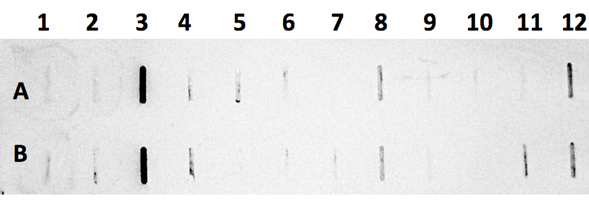 The DIG-NeabNPVPolh probe hybridized with its homologous sequence from the positive control (NeabNPVPolh sequence) placed in wells 3A and 3B in Figure 2 but did not produce significant signal in the two negative controls: tick DNA (1A and 1B) and DNA from healthy Zadiprion spp. cell culture (wells 2A and 2B). The test showed significant reaction consistent with DNA from three Z. ojedae subsamples from Guachochi, Chihuahua (wells 4A and 4B; 8A and 8B; and 12A and 12B in Figure 2). The remaining samples did not show consistent responses between replications; therefore, they were considered negative.
