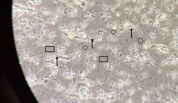 Figure 3 Macrophotographic section taken from a frotis of the abdominal region of a cadaver of Monoctenus cuauhtemoci. from Ixcateopan de Cuauhtémoc, Guerrero (sample 16 in Table 1). Phase contrast illumination and 400X magnification were used for this image. The circles surround small shiny bodies interpreted as baculiviral polyhedra. Arrows point to bacillary bacterial cells with a shiny body at each end, suggesting that they may belong to some variant of Bacillus thuringienesis. Rectangles surround cocci-like bacteria.
