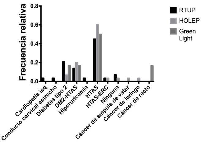 Todos los tratamientos mostraron que la comorbilidad más frecuente fue la hipertensión arterial (45% para RTUP, 60% para HOLEP y 50% para FTV).