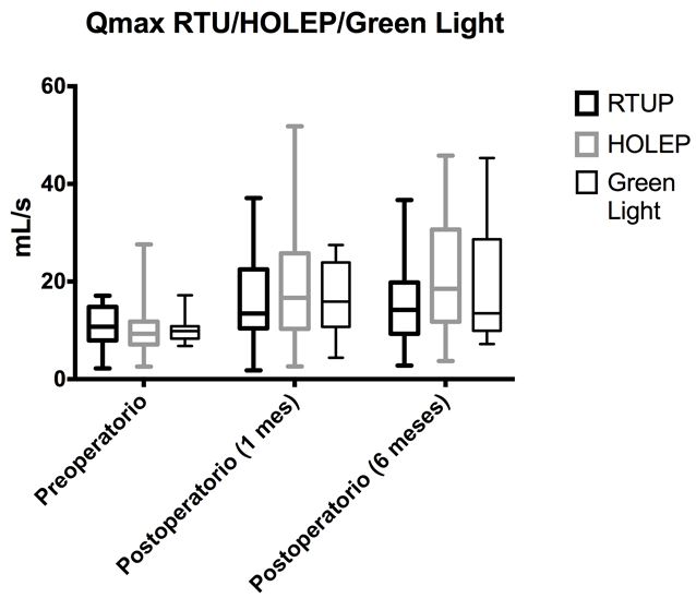 Los resultados obtenidos en cuanto a la mejoría del Qmax va de 7.6 ml/s de manera preoperatoria a un puntaje de 16.6 ml/s al mes del procedimiento y 15.4 ml/s a los 6 meses de la cirugía en el caso de RTUP; el Qmax preoperatorio en el caso de HOLEP es de 9.8 ml/s con una mejoría a 19.1 ml/s al mes y 20.8 ml/s a los 6 meses del postoperatorio y para FTV de 8.4 ml/s en el preoperatorio, se observó 16.4ml/s en el primer mes del postoperatorio y 18.8 ml/s a los 6 meses. No fue posible demostrar diferencia estadísticamente significativa entre las 3 poblaciones estudiadas (p=0.42), ya que nuevamente todas demostraron una mejoría significativa posterior al procedimiento quirúrgico, aunque nuevamente HOLEP mantuvo siempre una tendencia sostenida hasta los 6 meses del incremento del Q max (20.8 (± 11.07)) ml/s, en comparación con las otras 2 técnicas empleadas.