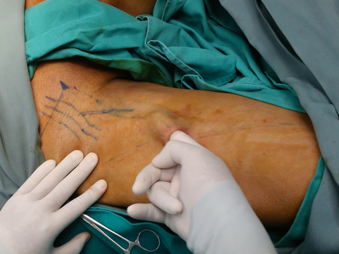 Colocación de trocares: Anatómicamente se delimitó el triángulo femoral teniendo como límites al ligamento inguinal (superior), músculo sartorio (lateral) y músculo aductor largo (medial). Se realizó la primera incisión horizontal de 15 mm a la altura del vértice inferior, a 3 cm, sobre la unión de los músculos sartorio y aductor largo, elaborando digitalmente un plano de disección a nivel de la fascia de Scarpa (Figura 1), colocando un trocar de 10 mm por el cual se introdujo la óptica de 0 grados e insufló CO2 a una presión inicial de 15 mmHg. Orientados por transiluminación se realizaron la segunda y tercera incisión, triangulando a 8 cm. de la primera, en sentido medial y lateral, colocando trócares de 10 y/o 5 mm. respectivamente, todos se fijaron a la piel con nylon 3/0.