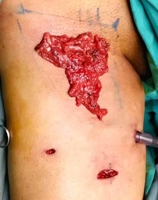 Retiro de pieza operatoria y colocación de drenaje: Culminada la etapa de resección, se retiró la pieza operatoria en bolsa a través de la ampliación de la herida del primer trocar (Figura 3).