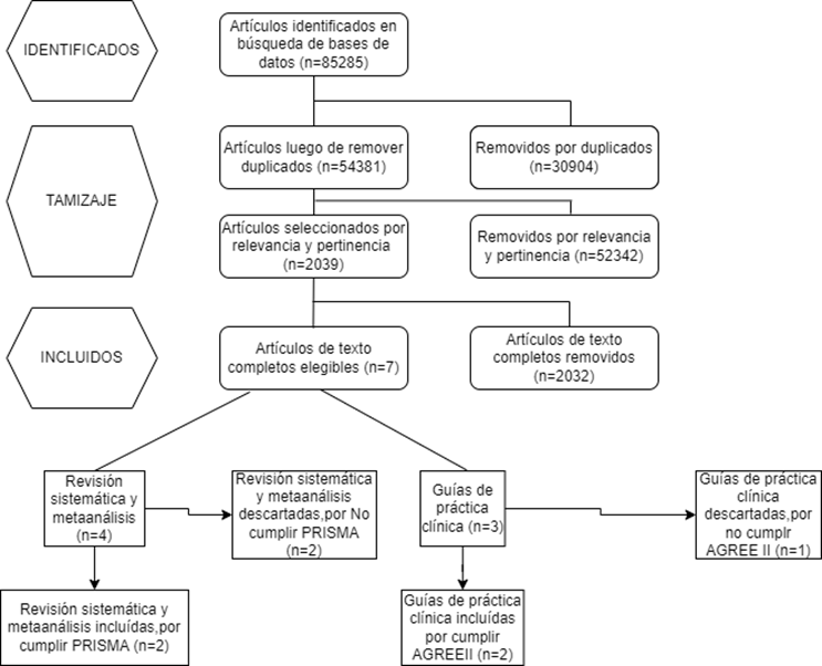 El autor realizó la revisión de los resúmenes de los artículos, seleccionó aquellos con la relevancia adecuada y que comparen varias técnicas transuretrales, luego realizó la evaluación y lectura completa de dichos artículos antes de proceder a la selección definitiva; posteriormente se realizó el análisis de calidad, mediante el cumplimento de las listas de verificación de PRISMA 2020 y AGREE II (Figura 1).