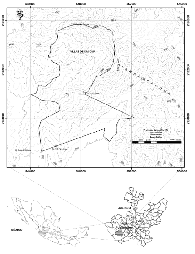 Área de estudio. El predio de Villas de Cacoma, forma parte de la sierra de Cacoma, en la Faja Transísmica Mexicana, en el estado de Jalisco, México y se localiza a 16 km al norte de Villa Purificación, la cabecera municipal. El predio tiene una superficie de 4,500 ha, delimitado por los vértices X = 544049.72-552240.95 y Y = 2185345.09-2195731, zona 13 norte, datum WGS 84 (Figura 1). La mayor superficie del predio se incluye en las microcuencas “Villa Purificación”, “El Pantano” y la “Estancia de Amborín”, las cuales a su vez forman parte de la cuenca Chacala-Purificación y Río Armería, de la Región Hidrológica “Costa de Jalisco” la cual drena al Océano Pacífico (UCDF, 1992). El predio forma parte de la Región Terrestre Prioritaria 63 (Arriaga et al., 2000 b) y la Hidrológica Prioritaria 24 (Arriaga et al., 2000a).