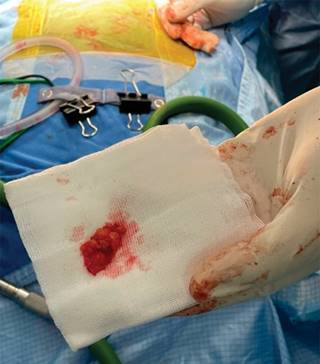 Figura 3: Imagen transquirúrgica de la tumoración intrarraquídea extradural extraída a nivel de L5-S1.