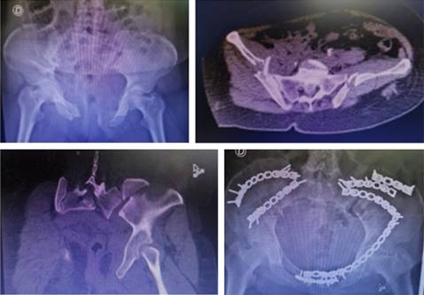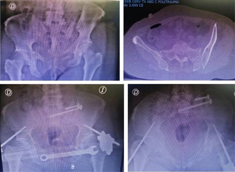 Tres pacientes fueron tratados secuencialmente con cirugía de control de daños (Figura 3) (con fijador supra-acetabular) y la osteosíntesis definitiva se realizó entre el tercero y octavo día de hospitalización.
