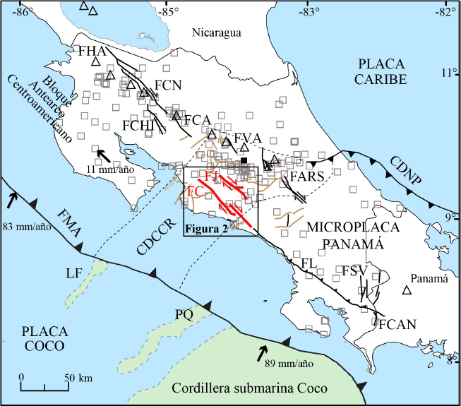 Figura 1 Contexto tectónico simplificado de Costa Rica mostrando los principales sistemas de fallas dextrales de acuerdo con Montero (2001) y Denyer et al. (2003). Se rotulan los siguientes elementos tectónicos: CDCCR Cinturón Deformado del Centro de Costa Rica, CDNP Cinturón Deformado del Norte de Panamá, FARS falla Atirro-Río Sucio, FCA Falla Cote-Arenal, FC falla Candelaria, FCAN falla Canoas, FCHI falla Chiripa, FCN falla Caño Negro, FHA falla Haciendas, FJ falla Jaris, FL falla longitudinal, FSV falla San Vito, FVA falla Viejo-Aguas Zarcas, FMA fosa Mesoamericana, LF levantamiento de Fisher y PQ Plateau de Quepos. Algunas fallas sinestrales relevantes se muestran como líneas café de acuerdo con la compilación de Rodríguez (2017). Los volcanes del Holoceno de Costa Rica se representan como triángulos y la ciudad de San José como un cuadrado. Las estaciones sismológicas se representan como cuadros grises. El recuadro señala el área mostrada en la Figura 2.