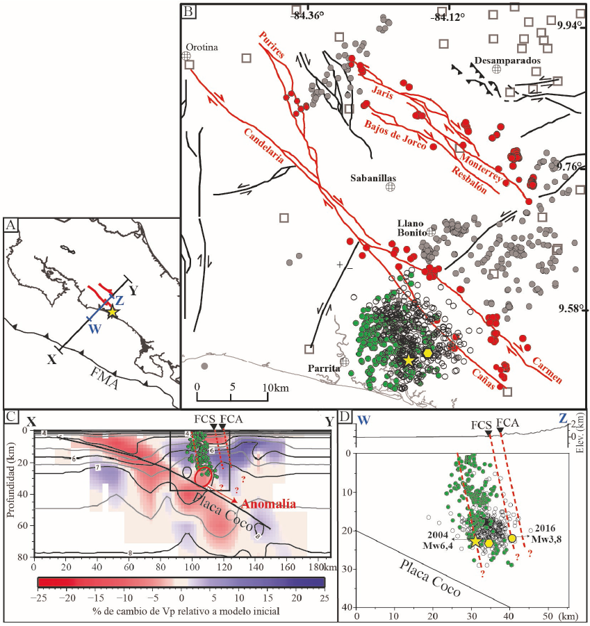 Desde 1976, la RSN registra en promedio dos sismos de magnitud momento (Mw) mayor o igual a 5.0 en la región del Pacífico Central de Costa Rica, la mayoría asociados con la subducción de la placa Coco. El 20 de noviembre del 2004, un sismo de Mw 6.4, conocido como el terremoto de Damas de Parrita, provocó serios daños en la región del Pacífico Central. Su epicentro estuvo localizado muy próximo (~5 km) al sistema de fallas Candelaria; sin embargo, estudios previos sobre este terremoto (e. g., Barquero y Rojas, 2004; Pacheco et al., 2006; Quintero et al., 2019) solo descartaron que este evento fuera ocasionado en la zona sismogénica de la subducción de la placa Coco y no concluyeron sobre su origen en una falla específica.