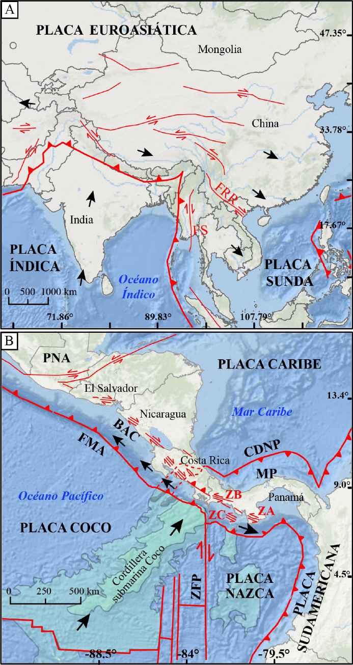 Figura 11 Comparación del contexto tectónico del sureste de Asia y de América Central. Las flechas negras gruesas marcan el sentido de movimiento de los bloques tectónicos. A) Mapa simplificado de la tectónica y grandes fallas en Asia oriental, modificado de Tapponnier et al. (1982). Las abreviaturas mostradas son las siguientes: FS: falla Sagaing, FRR: falla Río Rojo. B) Mapa tectónico simplificado de América Central mostrando la extrusión del Bloque Antearco Centroamericano (BAC). La línea roja discontinua es el área aproximada del CDCCR. Las abreviaturas mostradas son las siguientes: CDNP Cinturón Deformado del Norte de Panamá, FMA fosa Mesoamericana, MP Microplaca de Panamá, PNA Placa Norteamericana, ZA Zona de falla Azuero-Soná, ZB Zona de falla Ballena Celmira, ZC Zona de falla Coiba y ZFP Zona de Fractura de Panamá