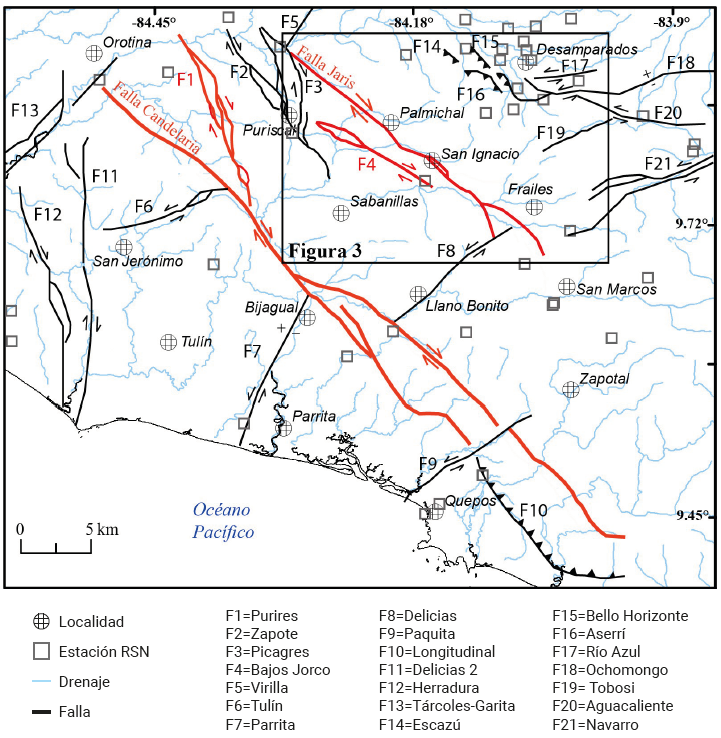 Las fallas mencionadas de tipo dextral en el arco volcánico de Guanacaste, se ubican a más de 300 km de la zona de contacto entre la cordillera Coco y la fosa Mesoamericana. Como parte del CDCCR, han sido descritas algunas fallas de geometría y dimensiones similares a las mencionadas, pero que se encuentran mucho más cerca de la zona de contacto entre la cordillera Coco y la fosa Mesoamericana. Algunos ejemplos son (Figura 1; Montero, 2001): las fallas Jaris (ubicada a 210 km), Candelaria (190 km), Atirro-Río Sucio (175 km) y Viejo-Aguas Zarcas (250 km). Estas fallas también se caracterizan por ser de tipo dextral y de gran longitud (35-150 km) y por tener un rumbo noroeste-sureste, una expresión geomorfológica prominente y sismicidad asociada.