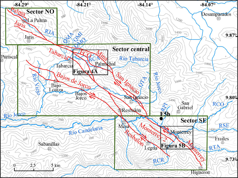 Figura 3 Mapa del sistema de fallas Jaris separando los sectores noroeste (NO), central y sureste (SE), con recuadros verdes. Se rotulan los siguientes drenajes con abreviaturas: QMA Quebrada Mata, QMI Quebrada Mina, QMO Quebrada Mónica, QTA Quebrada Tablazo, RCA Río Cañas, RCO Río Conejo, RCR Río Caraigres, RJA Río Jaris, RPI Río Pital, RSE Río Santa Elena y RTR Río Tarrazú y la falla Corralar (FCO). Los recuadros negros señalan las áreas mostradas en las figuras 4A y 5B. El punto F5b denota la localización de la fotografía mostrada en Figura 5B.