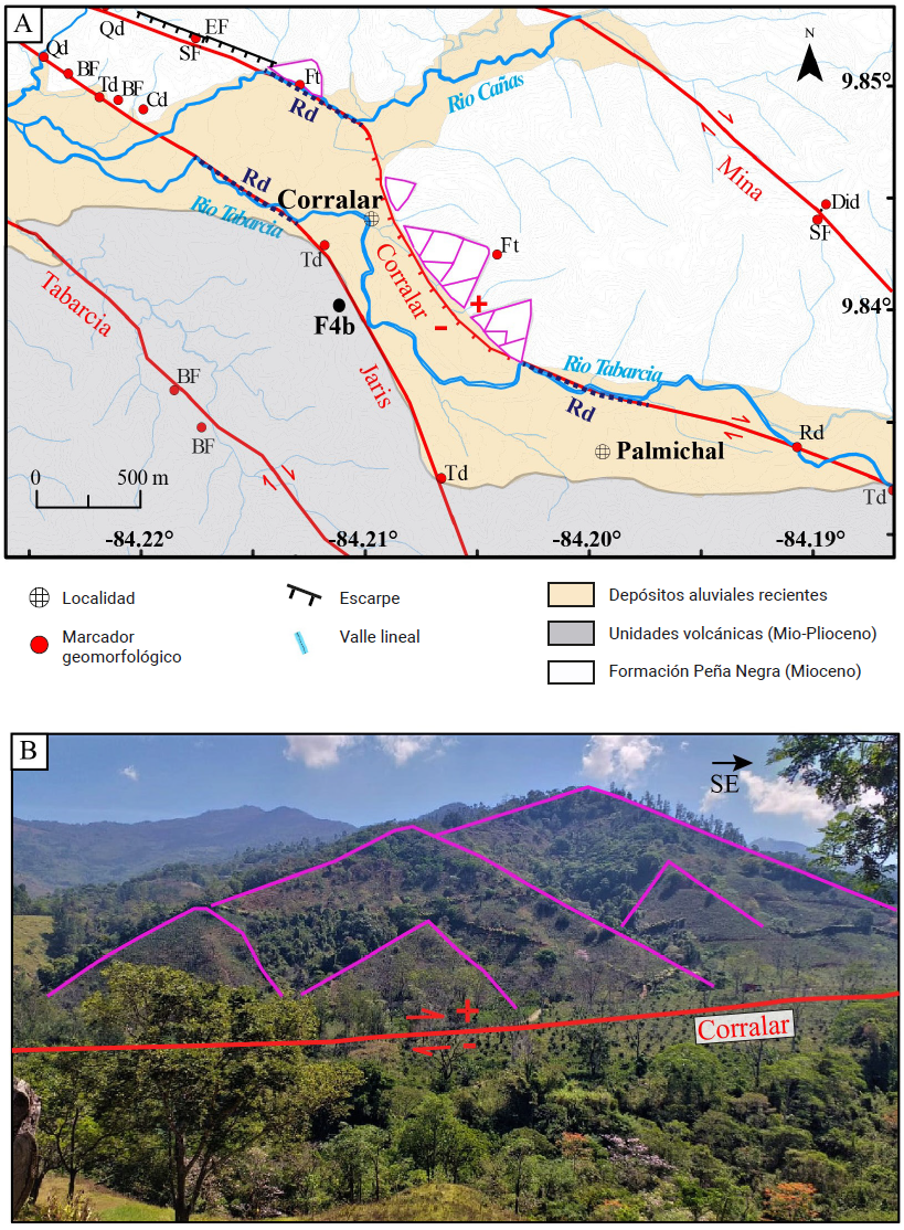 Figura 4 Neotectónica del sector central de la falla Jaris (Figura 3). A) Mapa de marcadores geomorfológicos en la zona de los poblados Corralar y Palmichal en donde ocurre el levantamiento del bloque este de la falla. Se muestran los siguientes elementos geomorfológicos: BF berma de falla, Cd colina desplazada, Did divisoria desviada, EF escarpe de falla, Ft faceta triangular, Qd quebrada desplazada, Rd río desplazado, SF silla de falla y Td terraza desplazada. Las facetas triangulares se muestran como líneas moradas y los ríos desplazados como una línea azul punteada. La geología es modificada de Denyer y Arias (1990). B) Fotografía tomada desde el punto F4b (Figura 4A) hacia el noreste mostrando tres generaciones de facetas triangulares (líneas moradas) del segmento de falla Corralar.