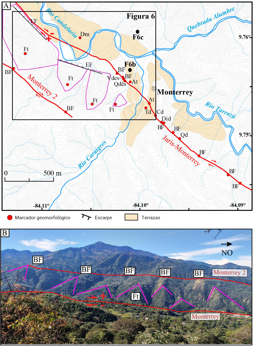 En la zona de confluencia de los ríos Tarrazú, Caraigres y Santa Elena, que dan origen al río Candelaria, existe una zona de depósitos aluviales de 0.5 km de ancho en donde se presentan al menos tres niveles de terrazas aluviales levantadas que son desplazadas al ser atravesadas por la falla Jaris-Monterrey (marcado con las abreviaturas At y Td en Figuras 5A y 6A,). Esta observación también fue documentada por Montero y Rojas (2014) quienes describen que estas terrazas se adelgazan al ser atravesadas por la falla. Finalmente, en este sector, existe el lineamiento de 5 km de longitud, paralelo a la falla Monterrey y ubicado a 1 km al suroeste de esta, que está caracterizado por bermas de falla (falla Monterrey 2 en Figuras 5, 6A y 6C).