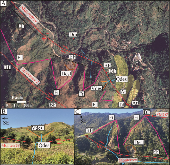 Al noreste de la localidad de Monterrey (Figuras 5A y 6), se reconoce la traza de la falla, principalmente por un escarpe de 100 m de alto, con facetas triangulares y con un pequeño deslizamiento activo cuya corona tiene 30 m de diámetro (Figuras 6A y 6C). Además, se identificó un valle que ha sido descabezado por el paso de la falla, generando a su vez un desvío hacia la izquierda del drenaje de aproximadamente 30 m (Figuras 6A y 6B).