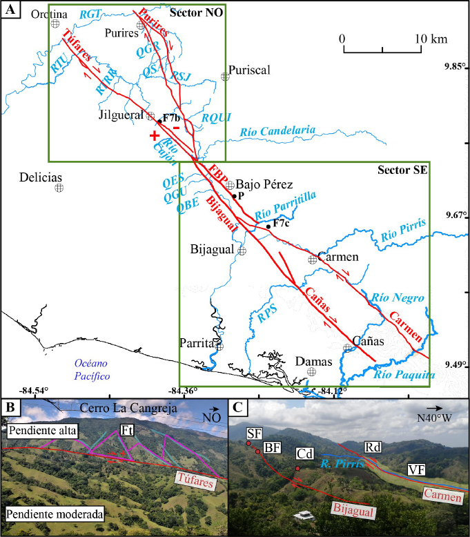 En este artículo, se considera como parte del mismo sistema a las fallas Purires y Candelaria descritas previamente en Arias y Denyer (1990a, 1991b), Montero (2001) y Montero y Rojas (2014). La falla Candelaria se divide en este trabajo en tres segmentos denominados: Tufares, Bijagual y Cañas. Además, se proponen las fallas Bajo Pérez y Carmen (Figura 7A, Tabla 1). Para su descripción, todo este grupo de fallas es separado en dos sectores: noroeste y sureste (Figura 7A) y el detalle de cada lineamiento geomorfológico puede ser consultado en Fallas (2022).