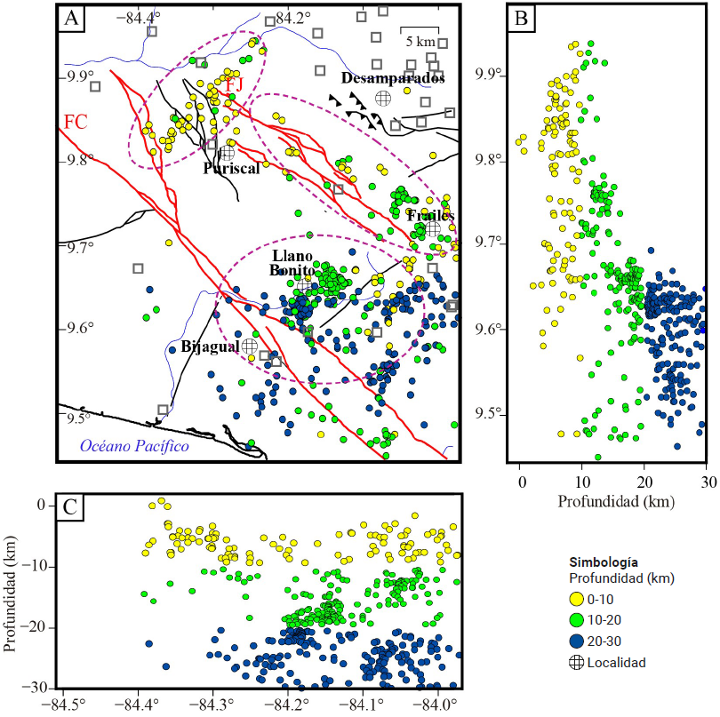 Geográficamente, los sismos localizados se distribuyen espacialmente en tres sectores (Figura 8A) que no corresponden exactamente con la ubicación de las tres secuencias sísmicas mencionadas. Esos sectores son al noroeste de Puriscal, al oeste de Frailes y entre los poblados de Llano Bonito y Bijagual. La tendencia general de los epicentros cercanos a la localidad de Puriscal es noreste-suroeste, no obstante, en la geomorfología no se observó lineamientos con esa orientación en ese sector. Aunque la localización general de estos epicentros no coincide con el rumbo general de los sistemas de fallas Picagres y Zapote (Figuras 2 y 8A), no se descarta que parte de esta sismicidad haya sido originada por esas fallas o en fallas ciegas de rumbo noreste-suroeste. La sismicidad de esta zona se caracteriza también por ser muy superficial, con profundidades usualmente menores a 10 km (Figura 8A) y con un promedio de 8 km.