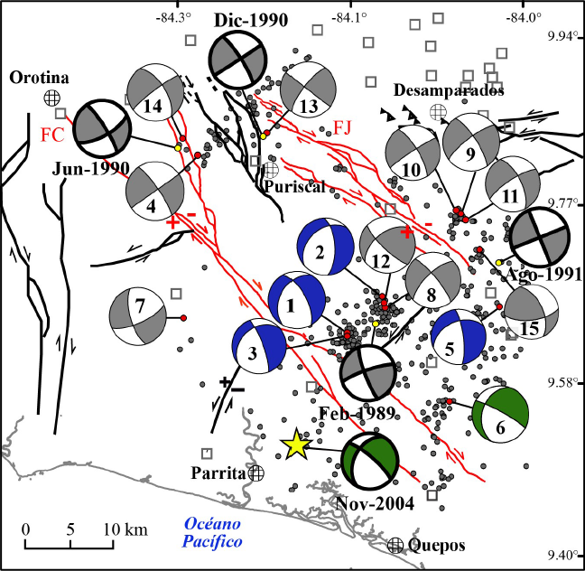 Los mecanismos focales para los cuatro eventos de 1989-1991 (Tabla 2; Figura 9) corresponden con fallas de desplazamiento de rumbo puro, mientras que el del terremoto de Damas del 2004 es oblicuo con una componente normal (Pacheco et al., 2006). Tomando en cuenta su mecanismo focal y la ubicación de los sismos con respecto de las fallas cartografiadas, se ha asociado el sismo de Puriscal de 1990 con la falla Purires (Montero y Rojas, 2014), el terremoto de Piedras Negras con la falla Picagres y el sismo de Frailes de 1991 con la falla Navarro (Montero et al., 2016). El sismo de Los Santos de 1989 no ha sido determinado claramente en la literatura (e.g., Barquero et al., 1989; Montero, 2001; Campos-Durán et al., 2021), no obstante, el epicentro relocalizado con los registros de la RSN se ubica 5 km al noreste de la falla Candelaria y 1 km al noroeste de la falla Delicias, por lo que no se descarta que esté asociado con alguna de estas estructuras. Finalmente, el origen del terremoto de Damas del 2004 no se ha establecido en una falla particular en la literatura y se detallará más adelante en este trabajo.