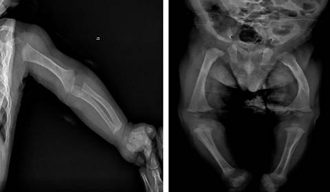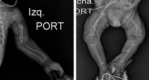 A los 62 días de vida presenta episodio de deterioro respiratorio, por lo que se realiza radiografía toracoabdominal en la que se evidencia disminución de la densidad radiológica ósea con presencia de signos de desmineralización, en particular deshilachamiento de metáfisis de húmero (Figura 1). Al tomar otras radiografías de las extremidades se evidenciaron múltiples fracturas de huesos largos, con signos de pérdida de línea metafisaria, desmineralización, deshilachamiento, imágenes en cáliz de copa (Figura 1).
