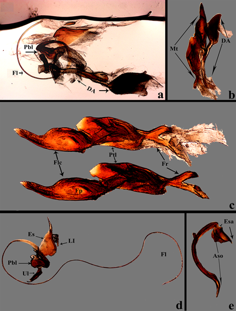 Figura 10 Estructuras internas en Ci. (c) carthagena. a) Estructura de algunas piezas del saco interno, se aprecia el flagelo, escudo, placa basal limitadores superior e inferior, el pedúnculo y la vejiga DA comprimida. objetivo 10 x. b) Estructura del diente medio y la DA, el pedúnculo es semiesclerotizado y en el ápice la vejiga se encuentra comprimida, vista frontal, objetivo 10x. c) Estructuración del diente medio en vista ventral, el ápice se compone de la flecha, en medio del petaloide y en la base de la furquilla, abajo se aprecia la estructura esclerotizada sin tejido blando, objetivo 20x. d) Flagelo completo, escudo, placa basal, limitador superior e inferior, objetivo 10x. e) Pieza arciforme sin tejido, el escudillo es una estructura plana y poco esclerotizada, el arco es flexible, objetivo 10x. Abreviaturas: Aso= Arco somal, DA= Vejiga dorsoapical, Es= Escudo, Esa= Escudillo, Fl= Flagele/Flagelo, Flc= Flecha, Fp= Fóvea periapical, Fr= Furquilla, Ll= Lower limitator/Limitador inferior, Mt= Median tooth/Diente medio, Pbl= Basal plate/Placa basal, Ptl=Petaloide y Ul= Upper limitator/Limitador superior.