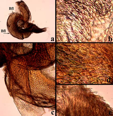 Figura 14 Estructuras internas en Ci. (c) carthagena. a) porción de las membranas que conforman las vejigas del saco interno, se aprecia un pliegue bisulcado en donde se inserta el flagelo (lo cual de acuerdo a Rivalier (1954) es característico del género), objetivo 10x. b) Acercamiento a la porción anterior, ya observándose el tegumento con más detalle, objetivo 20x. c) Tegumento “tipo 6” formado por un retículo diminuto en comparación al placoide, Objetivo 40x. d) Tegumento placoide, compuesto de microplacas imbricadas, objetivo 40x. e) Microplacas levantadas, objetivo 40x. Abreviaturas: Bfl= Bastilla flagelar.