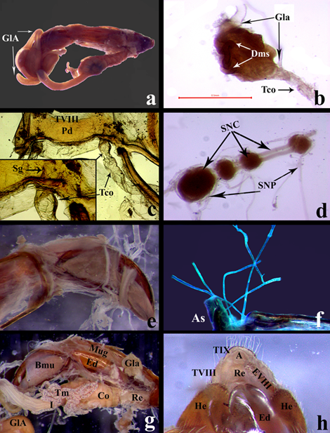Figura 16 Estructuras internas en Ci. (c) carthagena. a) Glándulas accesorias unidas por el conducto seminífero al edeago. b) Glándula abdominal encargada de producir los metabolitos repelentes, en el lateral existe un conducto externado. c) Tubo conectivo de la glándula abdominal unido a la base de la Pd, se aprecia el Surco glandular. d) Sistema nervioso central representado por los ganglios y el sistema nervioso periférico por las nervaduras externas. e) Tráqueas y nervaduras presentes en la musculatura de la base del edeago. f) Traqueolas internas del conducto seminífero una vez que este es retirado. g) Vista dorsolateral del proctodeo (sin vista a el ano). h) Vista ventral mostrando parte de la cápsula genital, el recto y el ano; el edeago se encuentra expulsado y plegado en el vientre. Abreviaturas: A= Ano, As= Alerón sagital, Bmu= Bloques musculares, Co= Colon, Dsm= Ducto somal, Ed= Edeago, EVIII= Esternito VIII, GlA= Glándula accesoria, Gla= Glándula abdominal, HE= Hemiesternitos, I= Íleo, Mug= Músculo genital, Pd= Placa distal, Re= Recto, Sg= Surco glandular, SNC= Sistema nervioso central, SNP= Sistema nervioso periférico, Tco= Tubo conectivo, Tm= Tubos de malpighi, TVIII= Terguito VIII y TIX= Terguito IX.