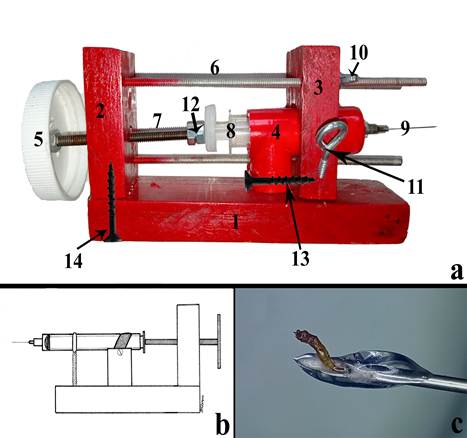 Para la eversión del endofalo se empleó un método casero en desarrollo, que se basa en el principio de Fukuda et al. (2015 & 2019). Este consistió en inyectar con una jeringa hipodérmica a la cual se le ha rebajado la punta con un esmeril para dejarla roma, una mezcla de agua y alcohol en proporciones 1:1. En el orificio de la jeringa se insertó el edeago por su región basal, se pegó en el orificio de la aguja y se selló con cianoacrilato comercial para uso en acuariofilia. El dispositivo fue fabricado con materiales caseros y consistió en un soporte para la jeringa y un tornillo de rosca fina que permite empujar el émbolo lentamente para inyectar el líquido hasta lograr evertir el endofalo (Anexo 1). Se describieron las estructuras de la genitalia con base en la terminología utilizada en literatura especializada para los cicindélidos (Rivalier, 1954; Matalin, 1998; Matalin, 1999; Fukuda et al., 2015; Fukuda et al., 2019). Aunque existen diferentes técnicas empleadas para la eversión del saco interno, hasta el momento y por disponibilidad este es el método por el cual se obtuvieron resultados positivos para las estructuras en Cicindelidae.