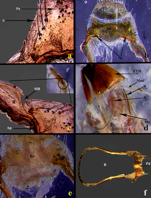 Terguito VIII (TVIII= Pd + R): por lo menos 4 veces más grande que el segmento apical, conformado por la placa distal y el anillo. Dorsalmente la Pd es de tegumento isodiamétrico, con dos ángulos posteriores proyectados hacia el ápice. La quetotaxia se ubica sobre los ángulos y se compone de 6 sedas largas blanquecinas a cada lado, las cuales se insertan en pápulas y no en fosetas; márgenes laterales (zona del limbo) ligeramente plegados hacia abajo (Figs. 2a y f); dos canales longitudinales poco visibles, las cuales van del apodema marginal hacia el ángulo y dividen el disco y el limbo, de los cuales sólo es posible visualizar la base en el microscopio óptico «Sutura glandular» Sg (Fig. 2b). El anillo funge como la extensión basal del TVIII o lo que corresponde al tegmen, similar en forma al del EVII (Ver Figuras. 1d y e), la diferencia radica en la unión, debido a que en el EVII el anillo está fusionado/connado a los hemiesternitos de manera horizontal; mientras que el anillo del TVIII posee una apófisis articulada, marcada por una muesca que deja libre la base marginal de la Pd, la extensión del anillo se curva y fusiona inmediatamente a la placa, formando un apodema basal, por lo tanto, la porción que se une a Pd queda en posición vertical (Fig. 2c). El largo de la estructura es proporcional para albergar la porción media terminal del edeago, quedando la base y parámeros fuera de la misma; en su porción basal se pliega en el marco basal del EVII, uniéndose a este por las Mmi, resguardando los paquetes de tejido muscular entre el EVIII y el EVII (Fig. 2d). Internamente Pd se encuentra cubierta por la Mme, de color blanquecina y de mayor grosor que la presente en los somitos externos II-VII y la fusión parcial del recto (Fig. 2e). Finalmente, la forma del anillo es semirectangular con los ángulos anteriores redondeados, la estructura es delgada y flexible (Fig. 2f).