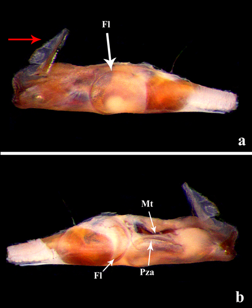 Figura 8 Estructuras internas en Ci. (c) carthagena. a) Endofalo en reposo lateral izquierdo, se aprecia parte de la estructura del flagelo; la flecha roja señala la membrana interna que sujeta el endofalo a la cutícula interna del lóbulo medio. b) Endofalo en vista lateral derecha, se aprecia parte estructural del flagelo, pieza arciforme y el diente medio. Abreviaturas: Fl= Flagelo, Mt= Median tooth/diente medio y Pza= Pieza arciforme.