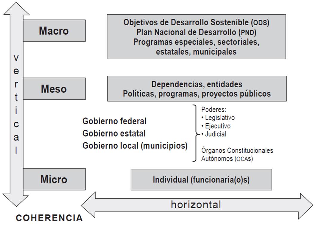 Respecto al alcance de la evaluación, especialistas como Ospina et al. (2004) plantean observarla en tres dimensiones (micro, meso y macro) o niveles de la gestión. Para ejemplificar estos niveles en el contexto mexicano, en la siguiente gráfica se observa el nivel micro, el cual evalúa el desempeño de la(o)s funcionaria(o)s, estructura fundamental para operar los programas públicos. En el nivel meso está la evaluación de las dependencias y entidades de los tres niveles de gobierno (federal, estatal, municipal), poderes (Ejecutivo, Legislativo y Judicial), entes públicos y Órganos Constitucionales Autónomos (OCA), así como políticas, programas y proyectos públicos.