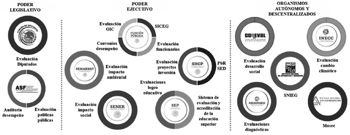 En otro apartado se describen los componentes esenciales para la institucionalización como la voluntad política para evaluar, estructura jurídica, evaluadores calificados, proceso evaluativo, etcétera. Posteriormente, considerando que la gestión pública es la evolución histórica del Estado y sus funciones (Pliscoff y Monje, 2003), se aborda el contexto histórico de los sistemas M&E implantados en las diferentes administraciones de gobierno y se pone énfasis en la Secretaría de la Función Pública (SFP) por su papel en el M&E del desempeño gubernamental y la Secretaría de Hacienda y Crédito Público (SHCP) por su relación con el Presupuesto basado en Resultados (PbR). Además de otros a cargo de la SEMARNAT, SENER, SEP, INECC, MEJORADU, SNA, Congreso y ASF.