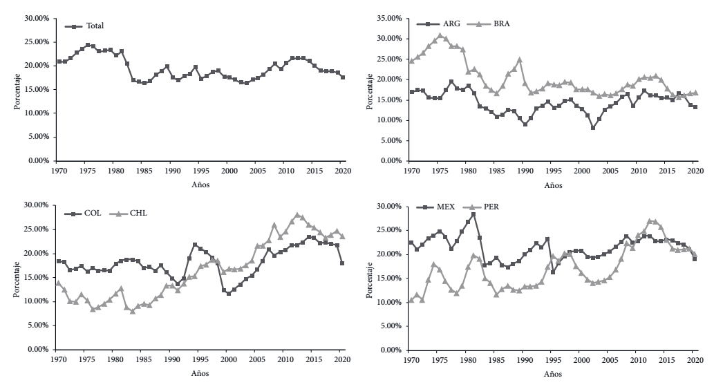 Las fluctuaciones en el acervo de capital están relacionadas con los cambios en el coeficiente de inversión. Entre 1970-1980 y 1990-2020 este coeficiente disminuyó en Argentina y Brasil, pero aumentó en Colombia, Chile y Perú, y permaneció relativamente estable en México (véase la figura 1 ).
