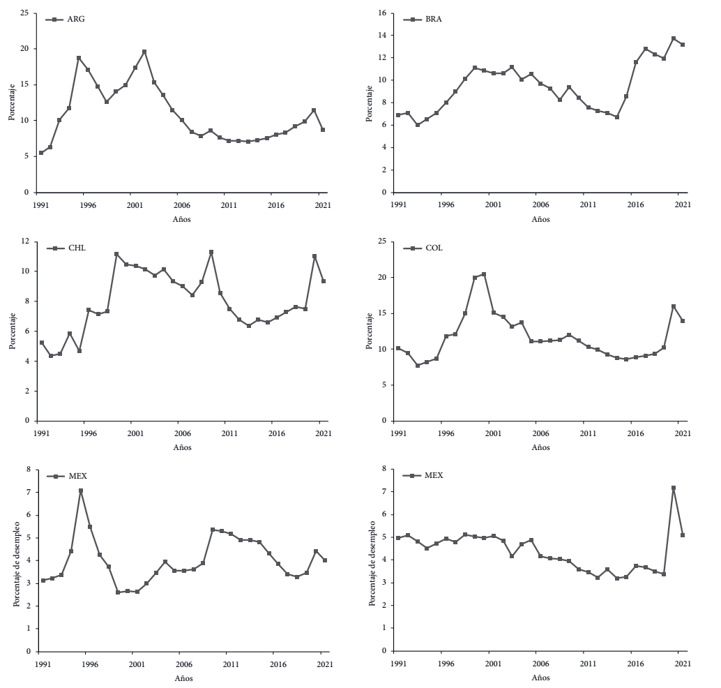 El desempeño económico de las economías de América Latina que estudiamos puede resumirse a través del comportamiento observado del producto, la acumulación de capital, el desempleo, la balanza de pagos y la inversión extranjera directa (ied). Presentamos cinco hechos estilizados de Argentina (ARG), Brasil (BRA), Chile (CHL), Colombia (COL), México (MEX) y Perú (PER) durante el periodo 1992-2020. Estas economías representan, en conjunto, el 81% del producto agregado de la región. Este periodo se caracteriza por procesos de liberalización económica, comercial y financiera, así como de desregulación y privatización. Se trata de una etapa de consolidación del modelo de desarrollo basado en el sector externo y la liberalización de los mercados.
