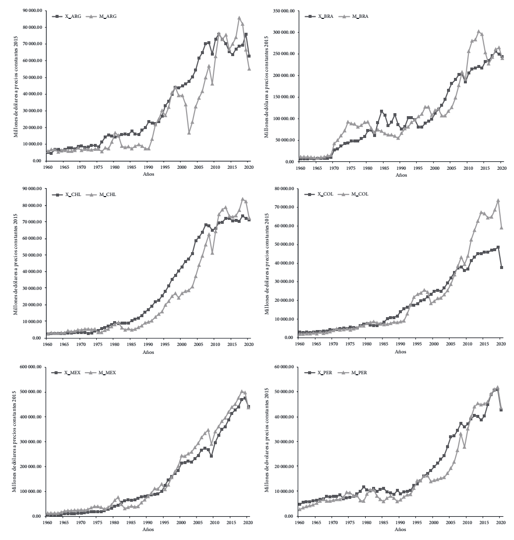 Figura 3 Exportaciones (X) e importaciones (M) en dólares a precios constantes de 2017