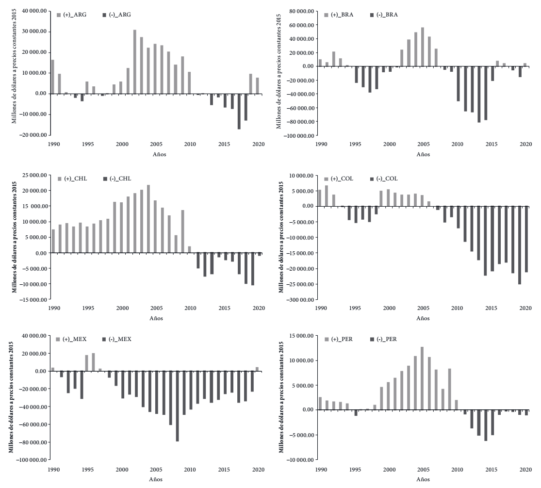 En cuarto lugar, se aprecia un co-movimiento de las exportaciones y las importaciones de las economías seleccionadas, siendo más notable en el caso de México (véase la figura 3). En la figura 4 se observa que la brecha entre el valor de las exportaciones y el valor de las importaciones influyó en el saldo deficitario o superavitario de la balanza comercial. En general, Brasil, Colombia y México presentaron déficits persistentes, mientras que Argentina, Chile y Perú mostraron saldos superavitarios. En el cuadro 4 se muestra que, entre 1990 y 2020, las importaciones crecieron a un ritmo superior al de las exportaciones.