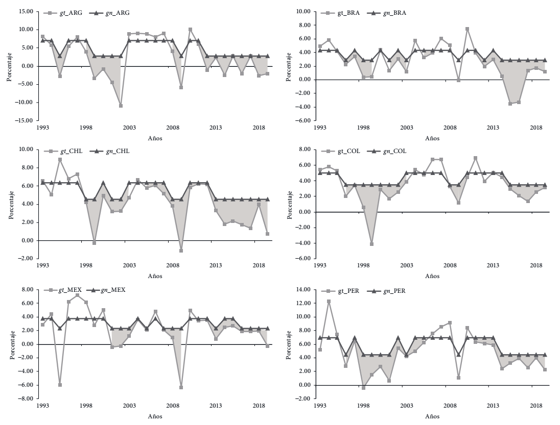 A continuación, estimamos la ecuación [19] por mco para determinar la tasa de crecimiento natural en periodos normales y de expansión. En la figura 5 mostramos la tasa de crecimiento natural y la tasa de crecimiento observada de las seis economías. La tasa natural utilizada es una tasa compuesta en los periodos en que la tasa observada es mayor que la natural; empleamos el valor de la tasa natural en los periodos de auge, mientras que para el resto de los años en los que esta condición no se cumple, usamos el valor de la tasa natural en periodos normales.