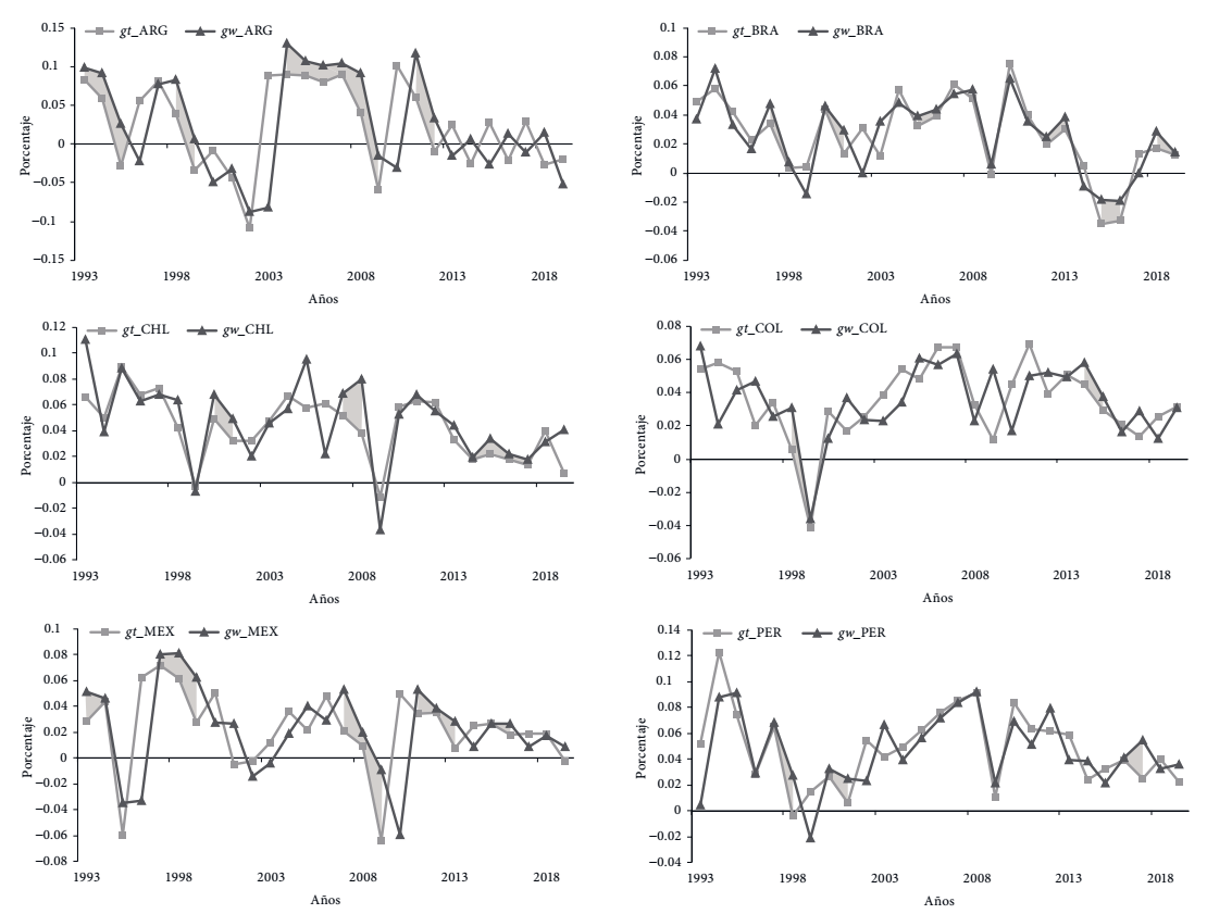 Para calcular g w empleamos las metodologías de Shaikh y Moudud (2004). Primero, expresamos las variables del producto Y, del acervo de capital K, en logaritmos ly y lk; luego analizamos su estacionariedad utilizando la prueba de adf.3 La variable ly resultó estacionaria en las seis economías, mientras que lk fue estacionaria en primeras diferencias para Argentina y México, y en segundas diferencias para los demás países. El resultado de las pruebas se muestra en el cuadro A2 del Anexo. Enseguida, calculamos la primera diferencia de ly, (D.ly) utilizando como variable independiente lk en el orden de diferencia en que resultó estacionaria, y una tendencia t para capturar los posibles efectos del tiempo. En la figura A3 del Anexo mostramos las gráficas que ilustran la relación entre las variables expresadas en diferencias.4 Se observa un comportamiento similar que sugiere la existencia de una relación lineal. A continuación, estimamos la ecuación ∆ly i = β0 + β1∆lk + β2 t por mco para cada economía. El resultado de las estimaciones se presenta en el cuadro A4 del Anexo. Para calcular el producto potencial, primero identificamos el año en el cual el producto efectivo alcanzó su máxima tasa de crecimiento. Luego, usamos el producto estimado para determinar la ce, mediante una regla de tres; g w es la tasa de crecimiento de la CE. En la figura 6 presentamos las tasas de crecimiento observada y garantizada para las seis economías. Se destacan en gris los periodos de más de un año donde la tasa garantizada superó a la tasa de crecimiento observada, lo cual indica que el capital disponible en la economía no se está utilizando de manera óptima. Se aprecia que la tasa observada oscila alrededor de la garantizada, pues depende del grado de aprovechamiento del capital instalado de cada economía.