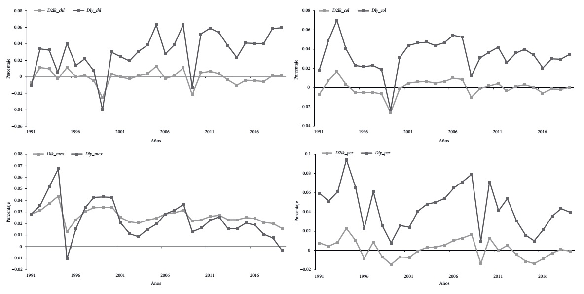 En segundo lugar, en Argentina, Brasil, Colombia y México, la tasa natural es superior a la tasa garantizada, lo cual indica que el crecimiento del capital fue insuficiente para absorber la fuerza de trabajo en estas economías, siendo el desempleo estructural un rasgo predominante en estos países. En los casos de Chile y Perú, la tasa garantizada es mayor que la tasa natural, el crecimiento del capital es superior al de la fuerza de trabajo; la tasa de crecimiento del producto no fue suficiente para impulsar la inversión en esas economías.