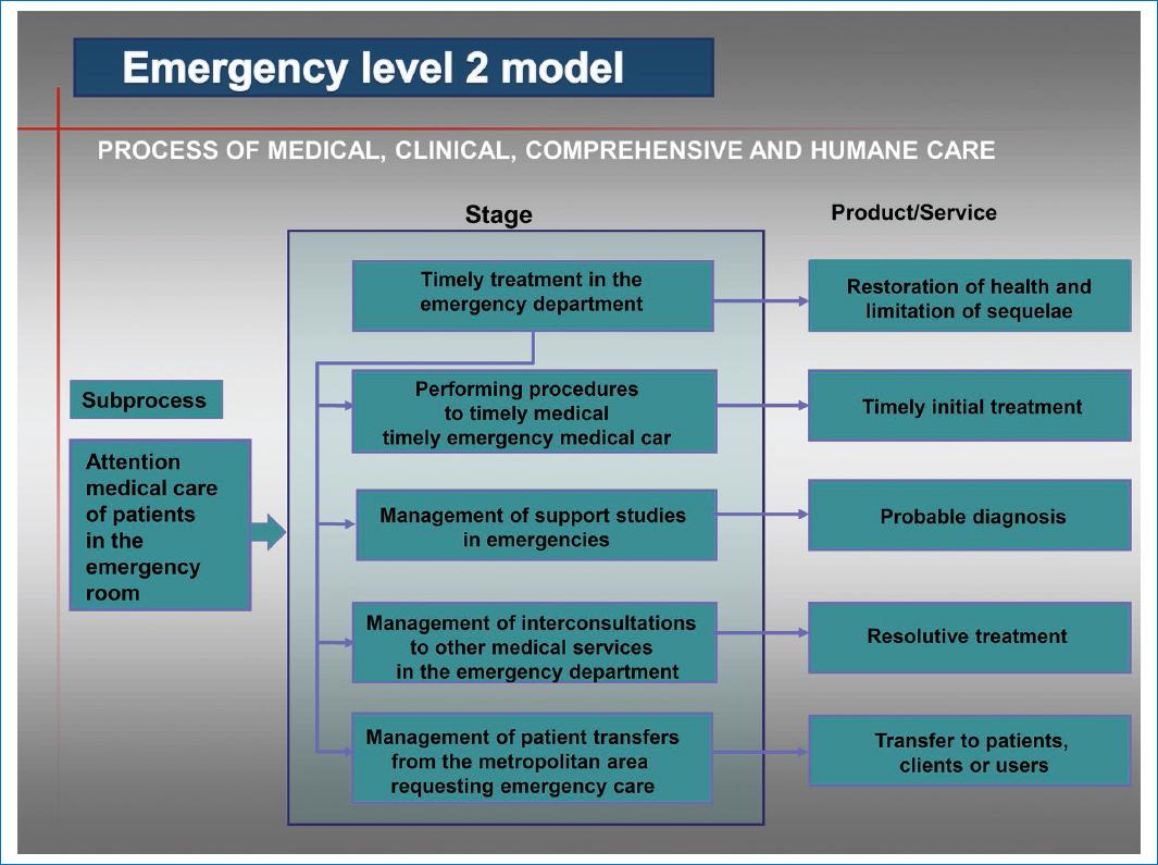 Figure 1 Level 2 emergency department model. The disaggregation of processes into subprocesses is called Level 2 map. This means that these subprocesses are further broken down into stages, and the medical care product or service provided to the client, user, or interested party in the ED is also determined.