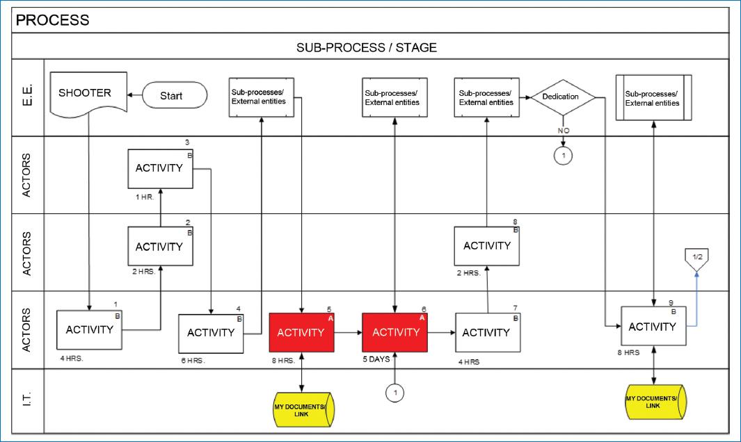 Figure 2 Class A, B, C Activity Diagnosis Map. This figure illustrates that the process, subprocess, or stage must be named and begins with a trigger (which can be a request or requirement for the creation of a medical product or service). All numbered activities performed by the various process actors are then unleashed, categorized as A, B, or C. In addition, part of the process automation performed through personal computer redirection is visualized. Activities marked in red are priority activities (of greater relevance), and these are where indicators, key performance indicators, or metrics will be established to guarantee the creation and delivery of a product or service in a timely and appropriate manner upon completion of the subprocess or process. External entities that connect to and contribute to the process through various regulations or value can also be observed. Source: Adapted from Microsoft Visio15.
