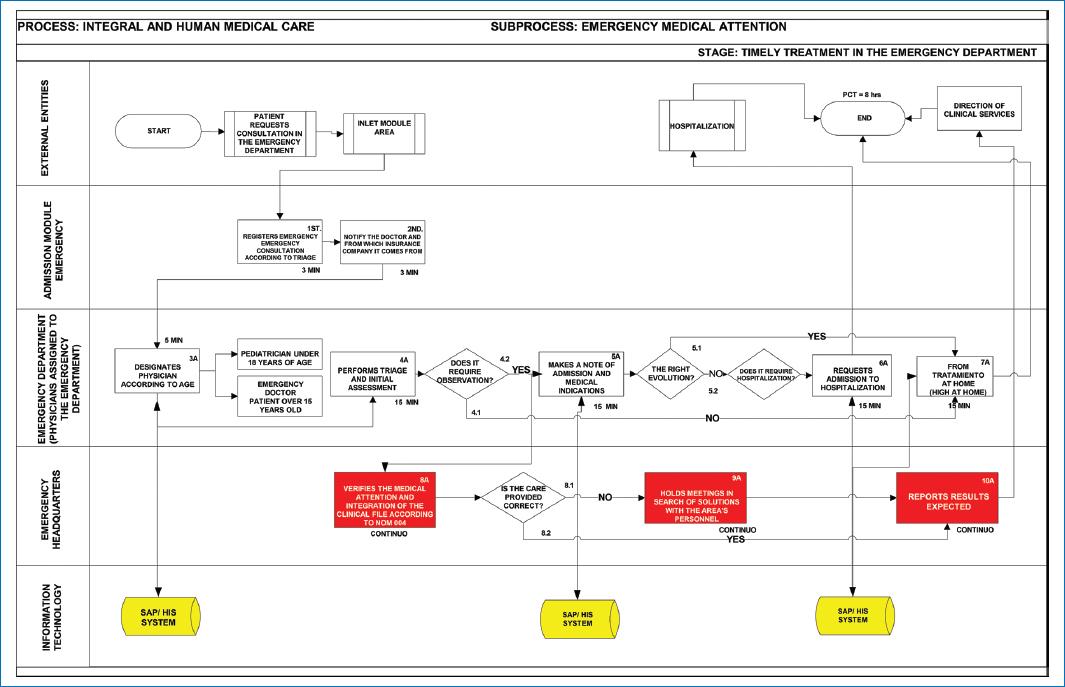 The World Health Organization defines urgency as an unexpected occurrence, in any place or activity, of a problem of diverse cause and variable severity that generates awareness of an imminent need for attention by the person suffering from it. Large, primarily private, highly specialized hospitals (HSHs) have been considered those that have so-called reference services in cardiac surgery, thoracic surgery, and neurosurgery1. Future trends regarding HSHs that should be considered when conducting a strategic reflection on these types of organizations include: New technological advancements, which affect diagnostic instruments, with a general trend toward more information obtained from less aggressive techniques and treatment. An increase in outpatient activity1. A study of emergency admissions in England found that more than a quarter of admissions did not require an overnight stay2. This implies that many emergency patients could benefit from ambulatory emergency care by having a systematic approach to process redesign. This involves immediate access to urgent care that would normally require the resources and expertise available in a hospital3. In Europe, the Dutch ensure the quality of medical care through the support provided to health centers by the CBO (National Organization for Quality Assurance in Hospitals), which is responsible for establishing, supervising, and evaluating activities with quality assurance in health care sectors. Another mechanism is the creation of a certification system4. A countless number of organizations express difficulties with execution strategy, lack of structure, and transparency in strategic management to achieve a structured description of the organization5. In practice, care models are not user-centered; they focus on disease recovery and increased technology consumption, and the need to drive change processes, with an emphasis on generating institutional conditions to integrate care processes6 as unique and distinctive value chains7, capable of efficiently sustaining quality care processes and patient safety, aligned with global policies. The process is redesigned through the analysis of each activity, identifying priority activities and analyzing categorization and value to the customer and the organization8.