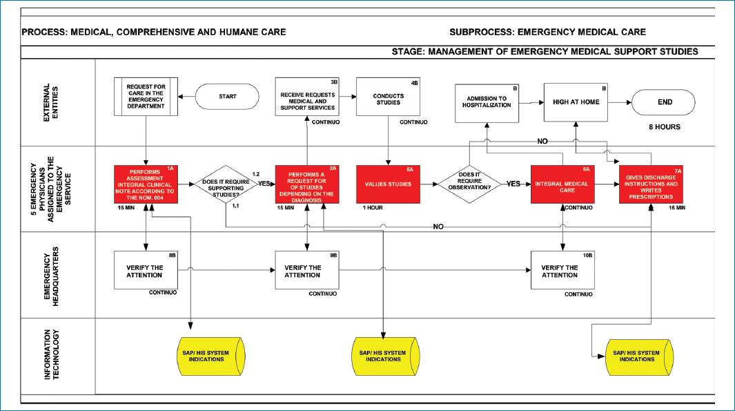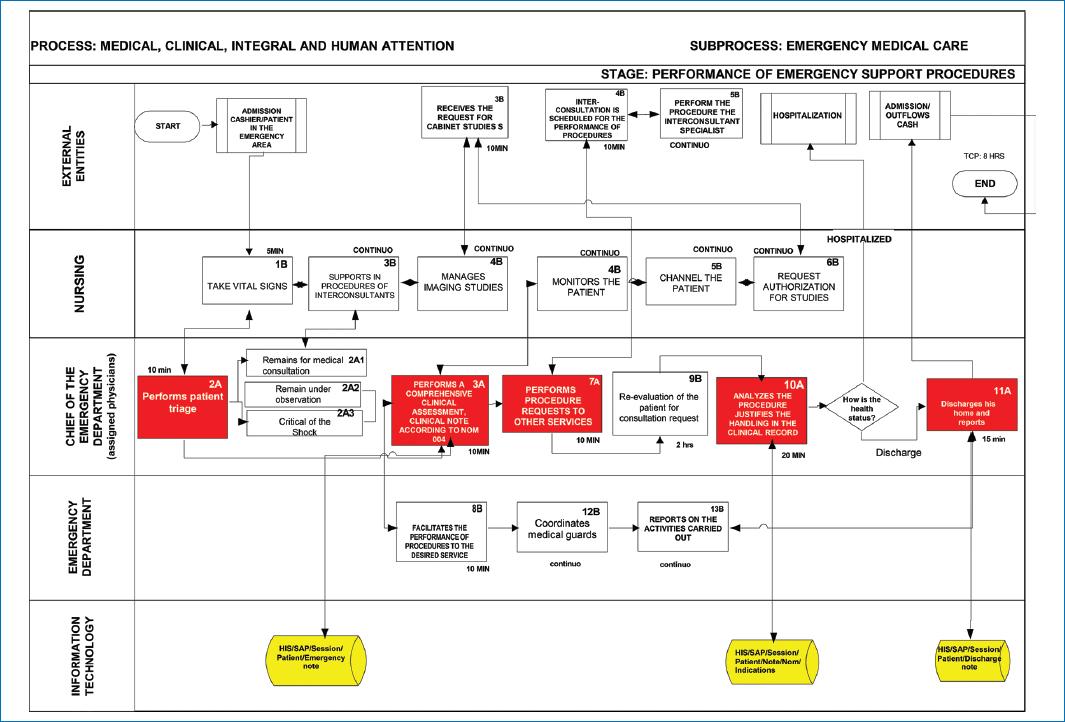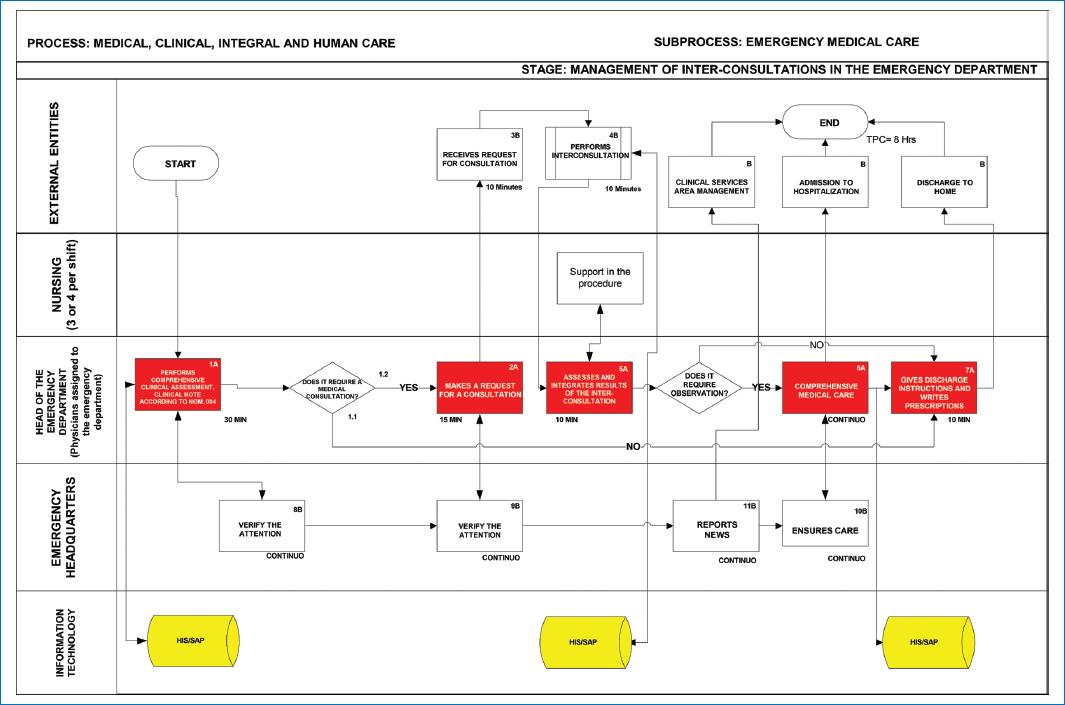 Figure 3 Redesigned and improved timely treatment map. This figure identifies the numbered sequential activities, with the average time of each Class A and B activity. The MCT is estimated at the end of the cross-functional mapping. It is read from top to bottom and left to right. The map is subdivided into: External entities: this section links, annotates, and interrelates entities, whether client-provider, such as Units, Departments, or organizations external to the process or subprocess; Processes: this section annotates the actors or process owners who participate internally in the performance of activities in the process or subprocess until the product or service is obtained; Information technology: this section specifies which activities are in automated systems or databases. Source: Adapted from Microsoft Visio15.