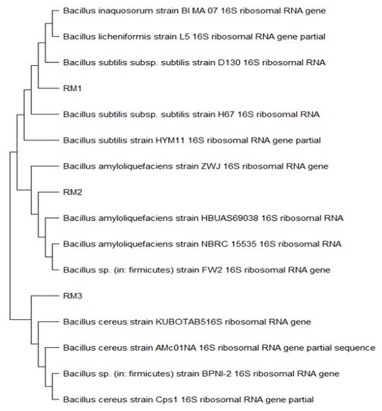 | RM3 | Bacillus cereus strain KUBOTAB5 16S ribosomal RNA gene, partial sequence. | 1512 | 99 | MK_855405.1 |