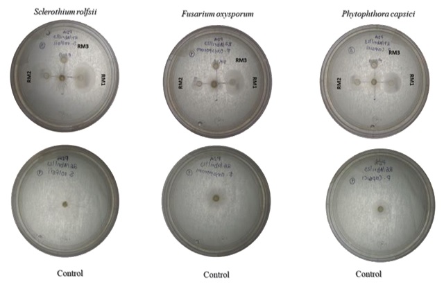Figure 3: In vitro antagonism of bacteria isolated in corn plants collected in fields of Cuatro Caminos, municipality of Guasave, Sinaloa, Mexico. Bacillus subtilis (RM1); B. amyloliquefaciens (RM2) and B.cereus (RM3), on the mycelial growth of Phytophthora capsici, Fusarium oxysporum and Sclerothium rolfsii.